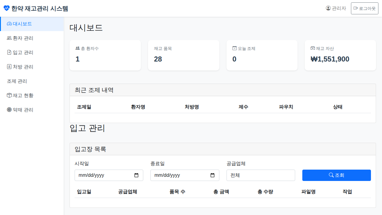 ## 처방 관리 (조제) 기능 - compounds API 추가 (목록/상세/환자별 조회) - 조제 시 자동 재고 차감 (FIFO) - 조제 내역 UI (EMR 스타일) - 조제 상세보기 모달 (처방구성, 재고소비내역) - 오늘/이번달 조제 통계 표시 ## 재고 원장 시스템 - stock-ledger API 구현 - 입출고 내역 실시간 추적 - 재고 현황 페이지 개선 (통계 카드 추가) - 입출고 원장 모달 UI - 약재별/전체 입출고 내역 조회 ## 확인된 동작 - 박주호 환자 오미자 200g 조제 - 재고 2000g → 1800g 정확히 차감 - 모든 입출고 stock_ledger에 기록 🤖 Generated with [Claude Code](https://claude.com/claude-code) Co-Authored-By: Claude <noreply@anthropic.com>